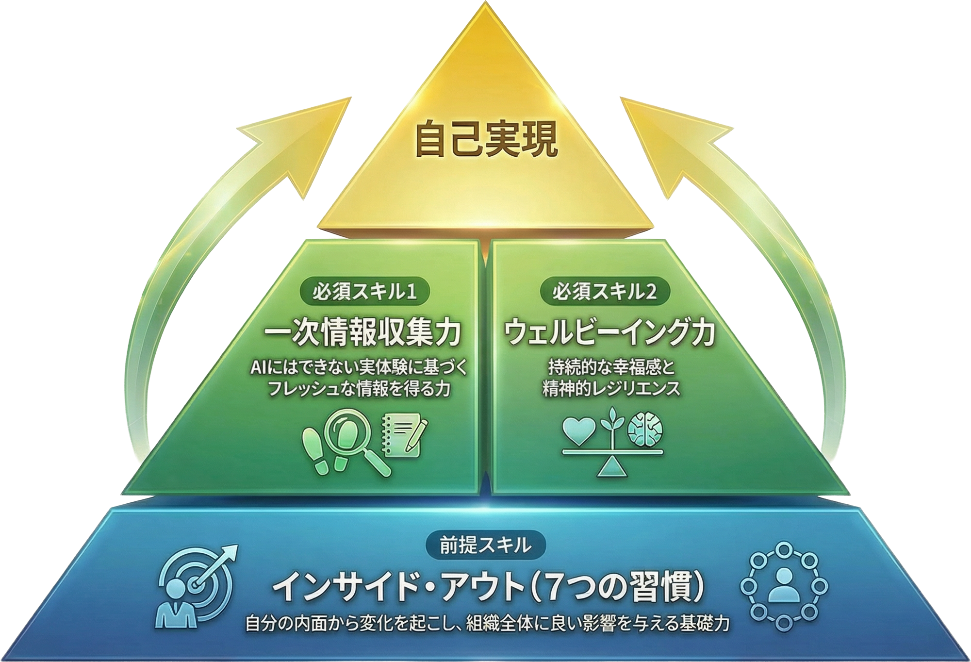 私たちは、「インサイド・アウト」の思考を土台に、一次情報収集力とウェルビーイング力を積み上げることで、自己実現へとつながると考えています。